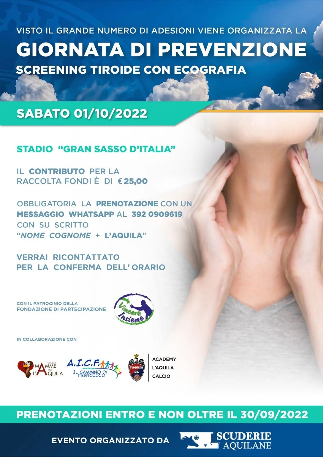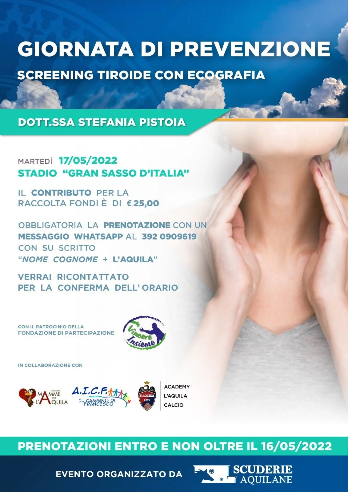 Questa volta la giornata è dedicata alla TIROIDE con effetuazione di uno screening ecografico. L'evento è in programma per marted' 17 maggio presso lo STADIO GRAN SASSO D'ITALIA